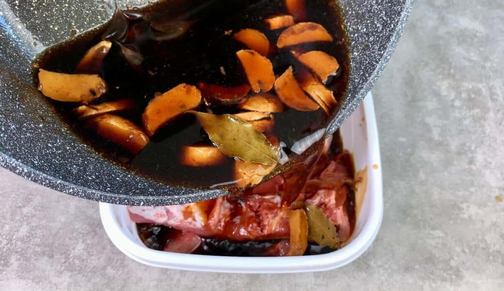 3. Укладаємо грудинку в ємність, заливаємо охололим маринадом і на добу відправляємо в холодильник. Маринад повинен повністю покривати м’ясо.