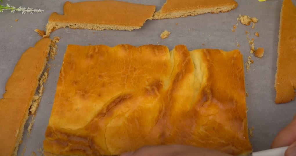 Остуджуємо корж, розрізаємо на 2 частини, обрізаємо, щоб одержати рівні прямокутники.