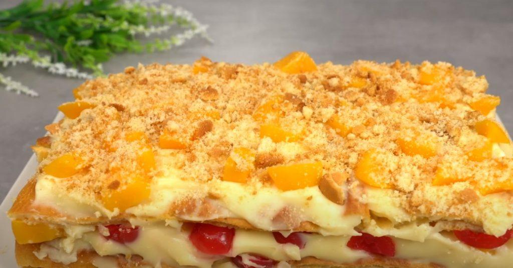 Формуємо торт, змащуючи коржі кремом, зверху викладаємо вишні та шматочки персиків, накриваємо другим коржем та повторюємо процедуру. Також і з третім, четвертим коржем.