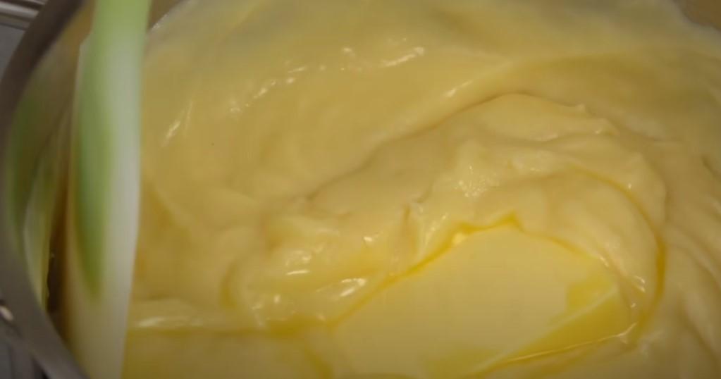 Варимо заварний крем із яєць, молока, цукру, ваніліну за смаком. Маса має бути густою та гладкою. Знімаємо з плити і додаємо вершкове масло, вимішуємо до однорідності. Охолоджуємо під плівкою.