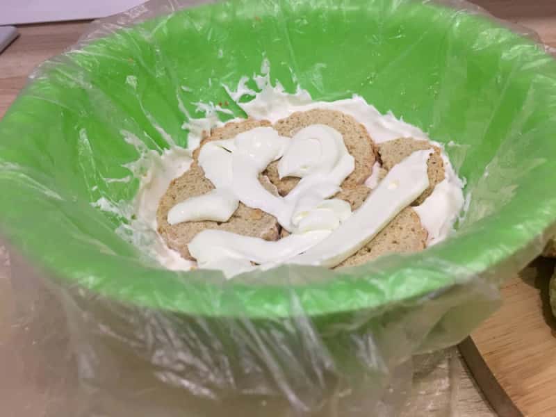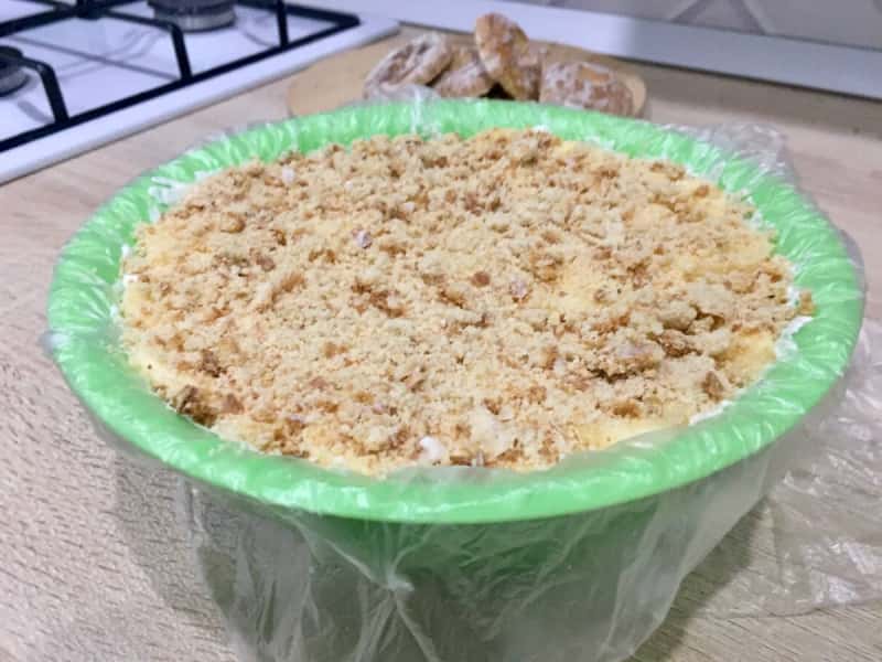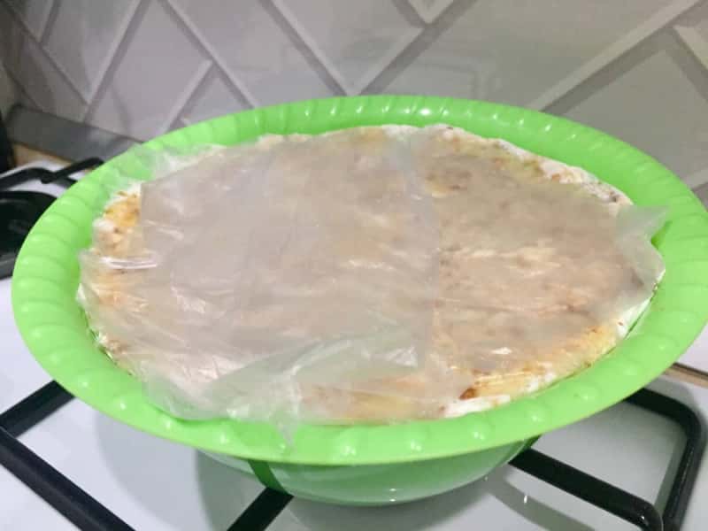 Піднімаємо кінці плівки наверх, закриваємо торт, трохи притискаємо по колу. Ми залишаємо на півгодини просочитися при кімнатній температурі, а потім ставимо в холодильник і тримаємо кілька годин ( краще на ніч ).