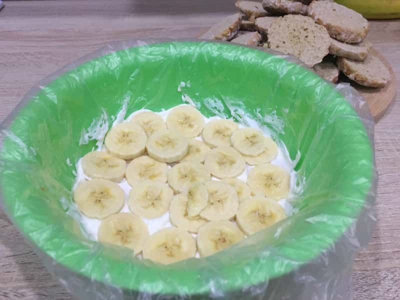 Банани нарізаємо кружечками товщиною 0,5 см. Робимо з них прошарок.