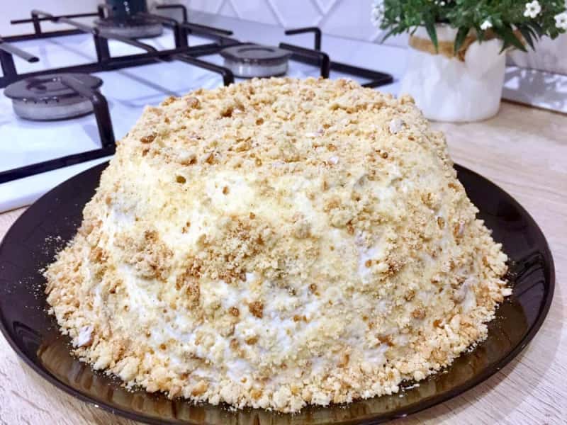 Потім перевертаємо на тарілку, прибираємо плівку. Весь торт обмазуємо сметаною і посипаємо пряниковими крихтами.