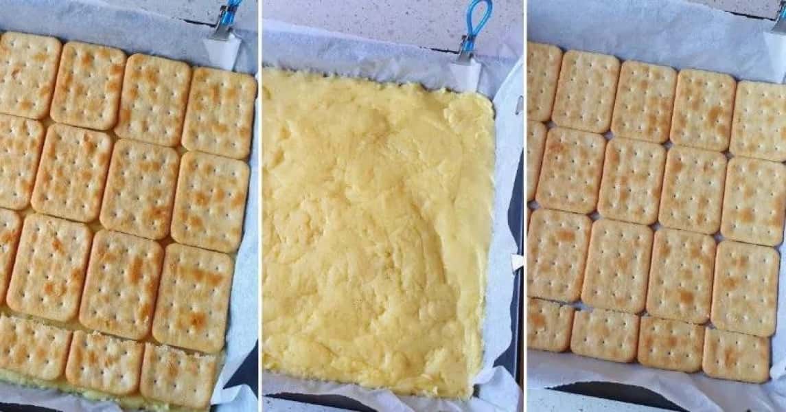 На деку, попередньо вистелену папером для випічки, викладіть шар крекерів. Поверх крекерів викладіть злегка теплий крем, потім зверху викладіть другий шар крекерів.