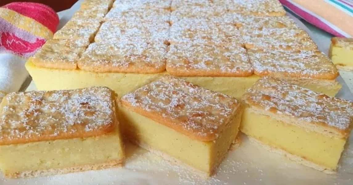 Злегка притисніть верхній шар крекерів. Деко відправте в холодильник на кілька годин (бажано на ніч). Перед подачею посипте торт цукровою пудрою.