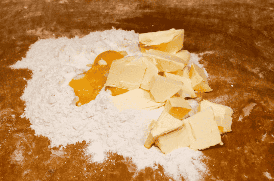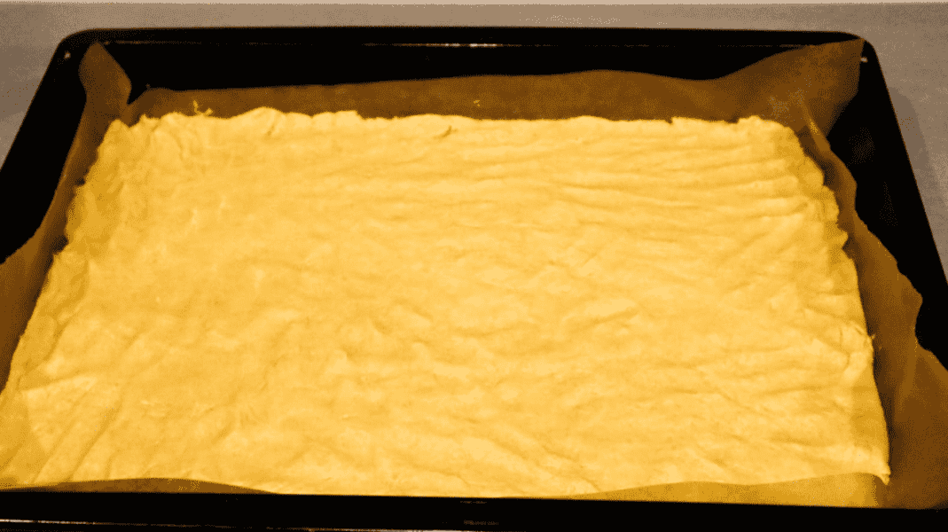 - Використовуючи борошно, цукор, маргарин, жовтки та розпушувач, замісити тісто. Викладіть його на велике деко з духовки;