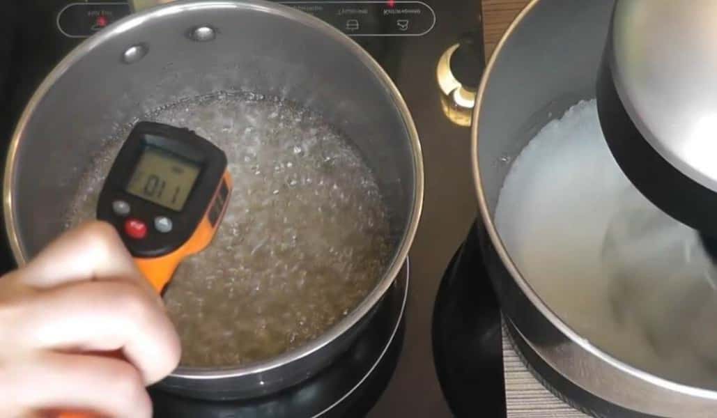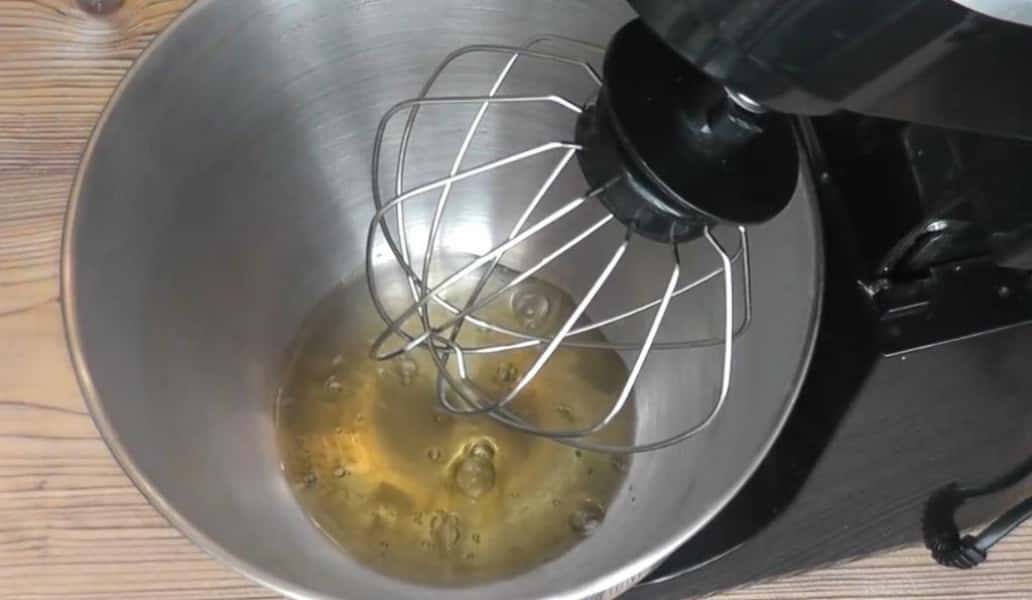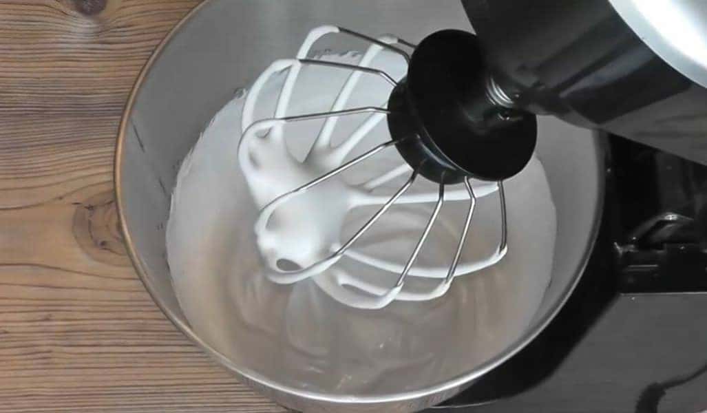 У сотейник наливаємо 100 мілілітрів води, насипаємо 270 грам цукру і 10 грам ванільного цукру, ставимо на вогонь. Поки цукор не розчинився, можна перемішувати сироп. Після закипання чекаємо температури 110 градусів. Якщо у Вас немає термометра, доводьте рідину до стану густого сиропу. Коли температура досягне 110 градусів, сироп стає злегка карамельного відтінку і струмінь з лопатки стікає безперервно, а бульбашки лопаються більш повільніше, ніж тоді, коли температура ще не досягла. Якщо білки досить збилися в густу і пишну масу, то тонкою цівкою наливаємо сироп і продовжуємо збивати на середніх оборотах міксера. Коли сироп введений — збиваємо масу ще хвилини 2-3.