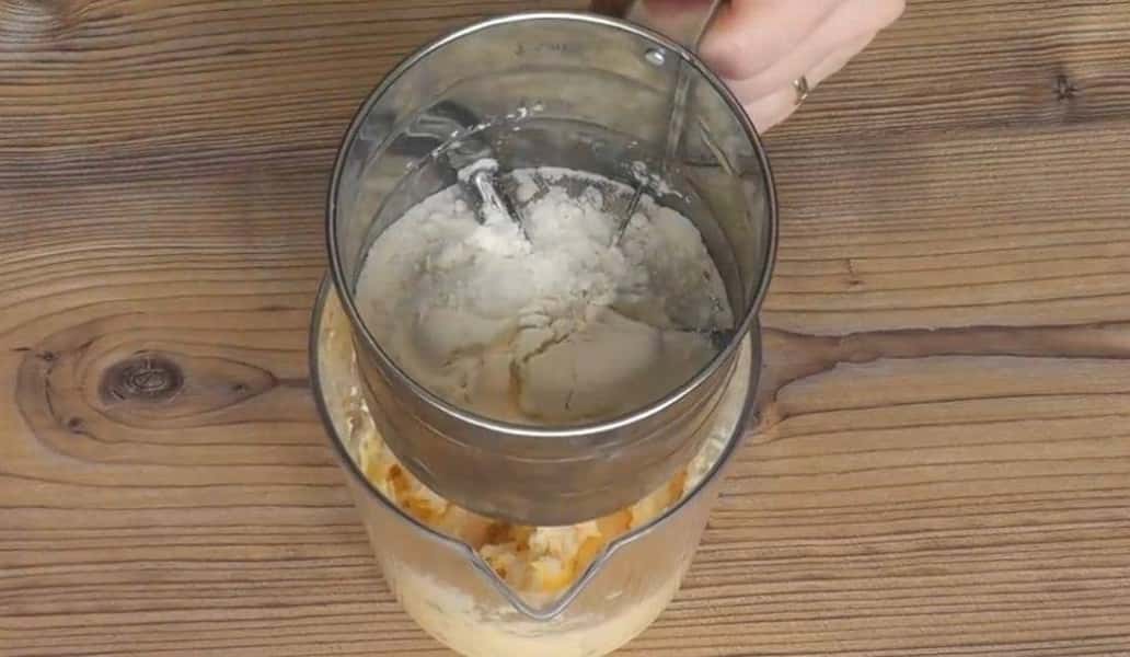В окремій ємності з’єднуємо 100 грам борошна і половину чайної ложки розпушувача, ретельно перемішуємо суміш. Просіюємо суху суміш в раніше приготовлену масу і збиваємо міксером на найменшій швидкості до однорідного стану. Тіста на вигляд виходить мало, але не лякайтеся, так і повинно бути.