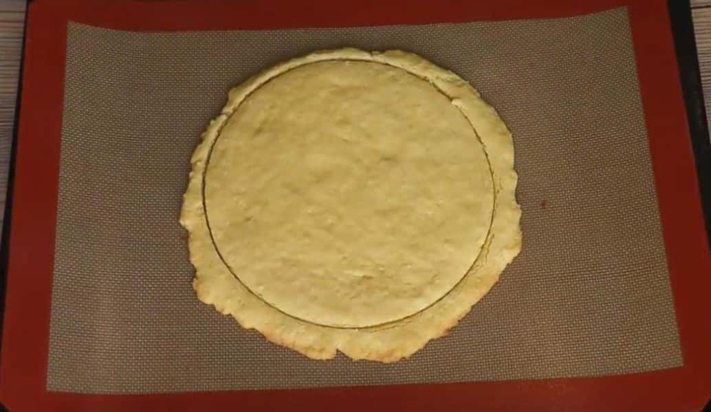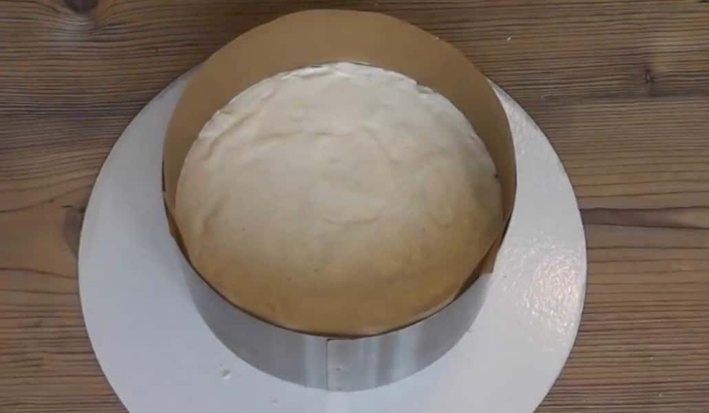 Тісто викладаємо на папір для випічки і мокрою ложкою вирівнюємо тісто до потрібного діаметру. Вирівнюйте тісто до діаметра трохи більше вашої форми, щоб потім обрізати краї. За допомогою тієї ж ложки постарайтеся вирівняти поверхню, щоб корж піднімався максимально рівно. Запікаємо корж при температурі 180 градусів близько 12-15 хвилин. Після випікання вирізаємо коло потрібного діаметру.
