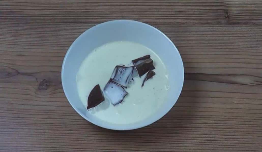 Розігріваємо 100 грам жирних вершків будь-яким зручним способом і заливаємо ними 100 грам темного подрібненого шоколаду. Ми залишаємо на пару хвилин, щоб шоколад розтанув, потім ложечкою перемішуємо до однорідної шоколадної маси.