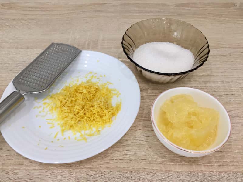 Лимон заливаємо окропом, залишаємо на 10 хвилин. Потім знімаємо цедру ( тільки шкірку жовтого кольору ) дрібною теркою.