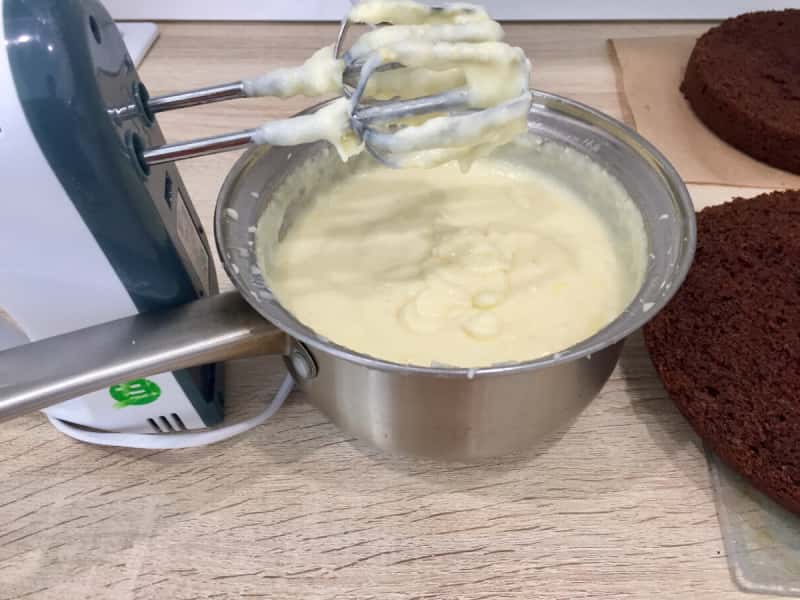 Закриваємо крем плівкою “вконтакт” і чекаємо, коли охолоне. Потім злегка збиваємо (можна просто виделкою або вінчиком) – вирівнюємо консистенцію.