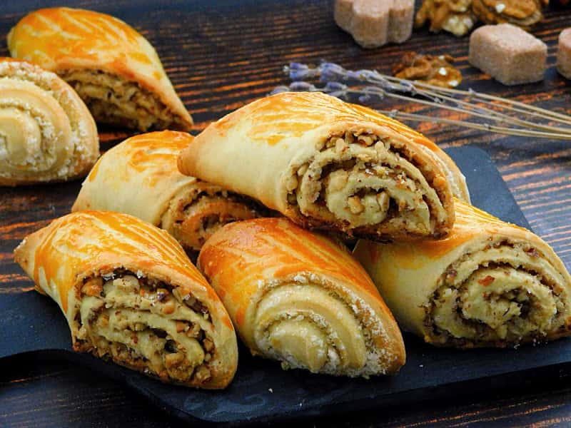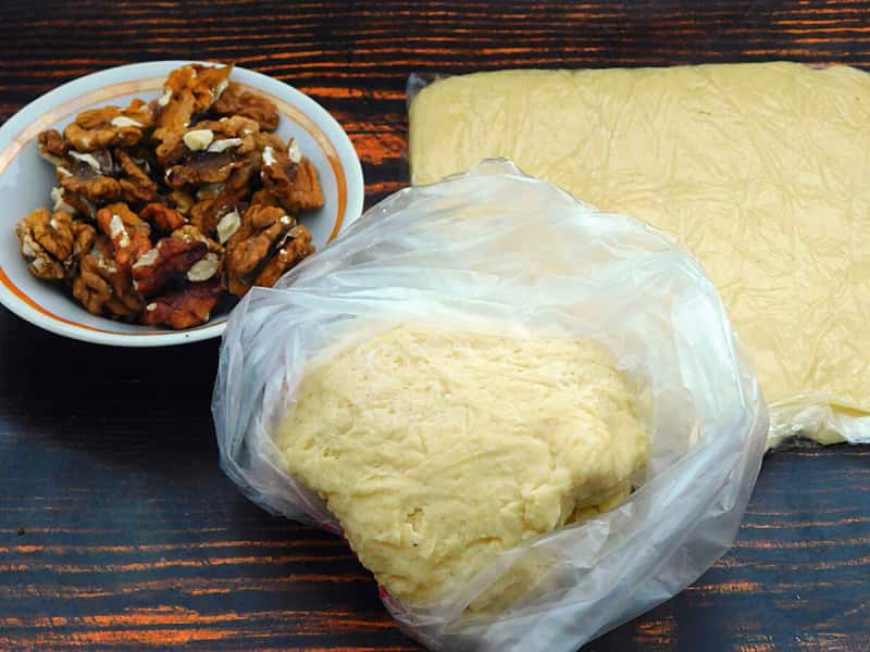 Замісити маслянисте м’яке тісто. Розділити на дві частини. Кожну помістити в целофановий пакет і прибрати на півгодини в холодильник. Щоб прискорити процес охолодження, можна розпластати його всередині мішка.