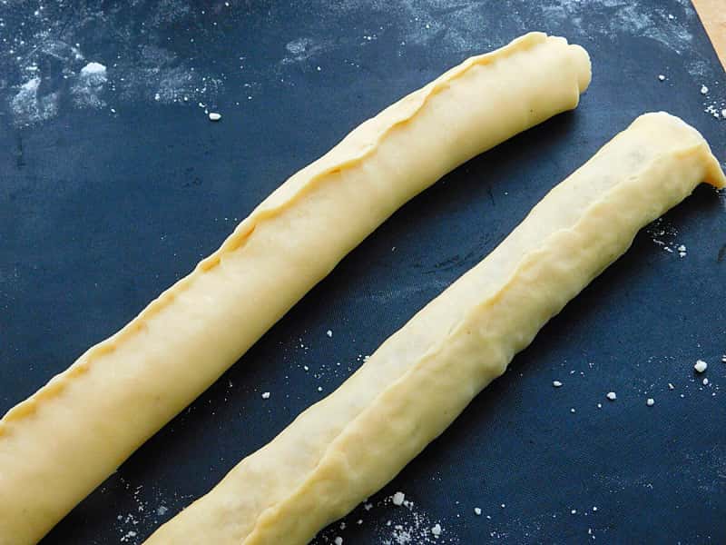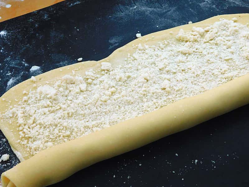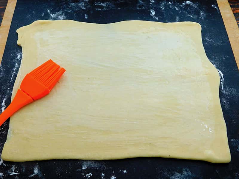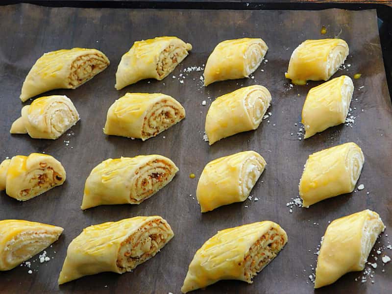 Першу порцію тіста розкачати в прямокутник до товщини 3 мм. Яйце розділити на білок і жовток. Жовток знадобиться пізніше, а білком змастити тісто.