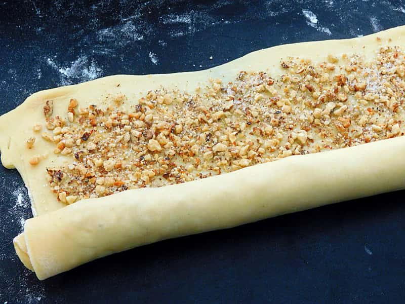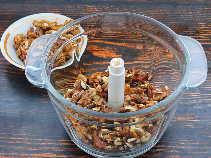 Для начинки волоські горіхи попередньо підсушити на сковорідці, дати охолонути і насипати в чашу кухонного комбайна.