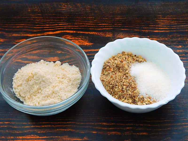Прокрутити до отримання різної крихти. Всипати цукор, змішати. У нас є два види начинки: горіхова і масляний штрейзель.