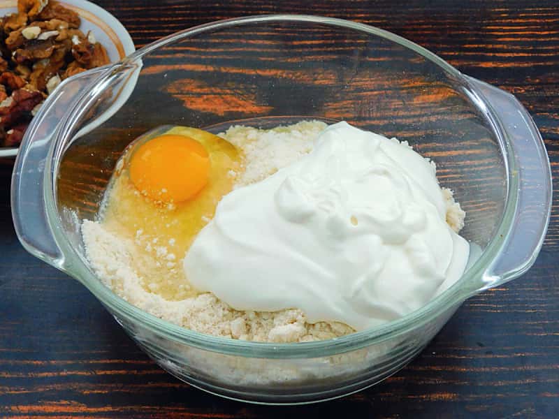 Перетерти руками в крихту. 2 столових ложки відразу ж відсипати ( цей штрейзель буде одним з видів начинки ). У миску до решти розбити яйце, додати сметану.