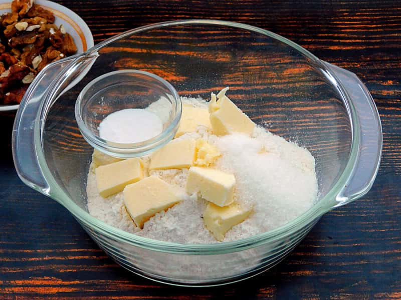 У миску помістити борошно, цукор, сіль, харчову соду і шматочки холодного вершкового масла.
