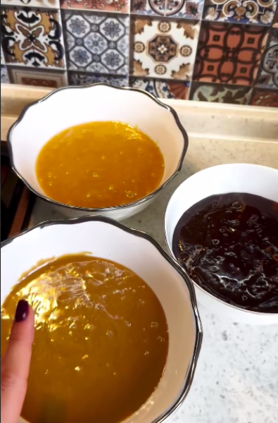 В каструльці з товстим дном змішуємо масло, цукор і мед, ставимо на повільний вогонь і постійно помішуємо до розчинення цукру.