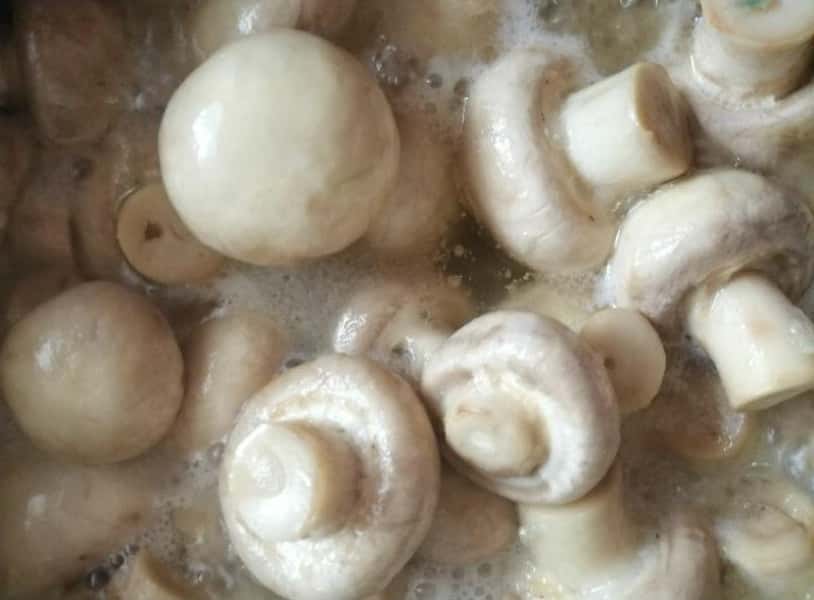 Каструлю ставимо на плиту і доводимо до кипіння. Після закипання зменшуємо вогонь і відварюємо гриби періодично помішуючи протягом 4 хвилин ( я варила трохи довше ). Води додавати не треба, гриби почнуть виділяти « сік ».