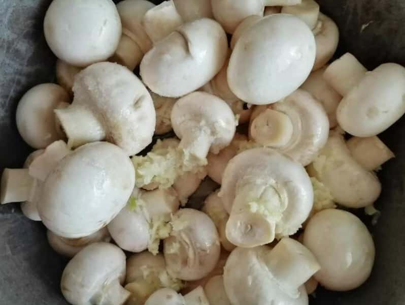 Далі додаємо до грибів сіль, цукор і оцет. А також олію, чорний перець горошком, лавровий лист і часник, пропущений через прес. Все акуратно перемішуємо.