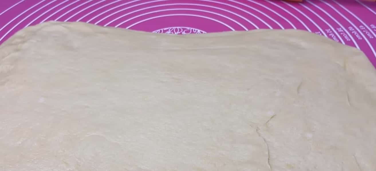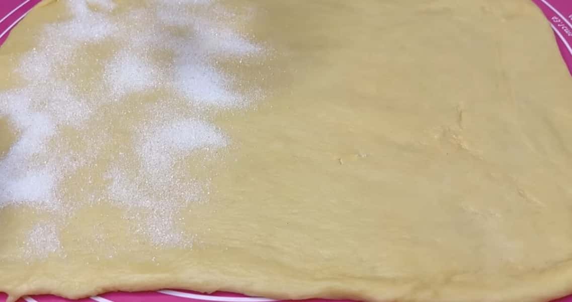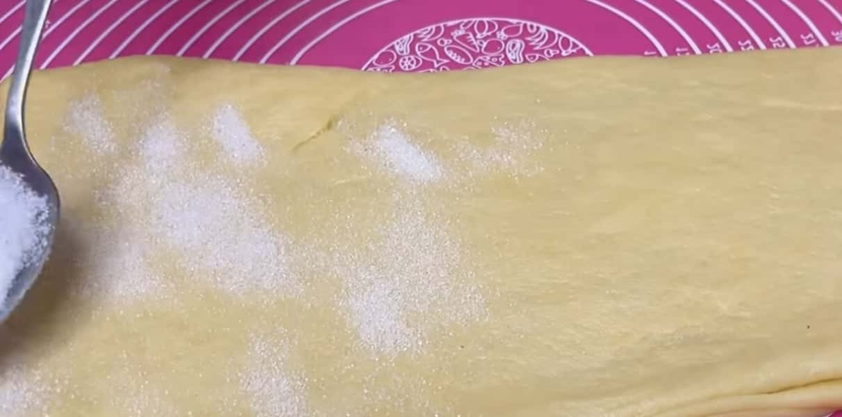 Розкачуємо тісто і посипаємо на одну половину цукром.