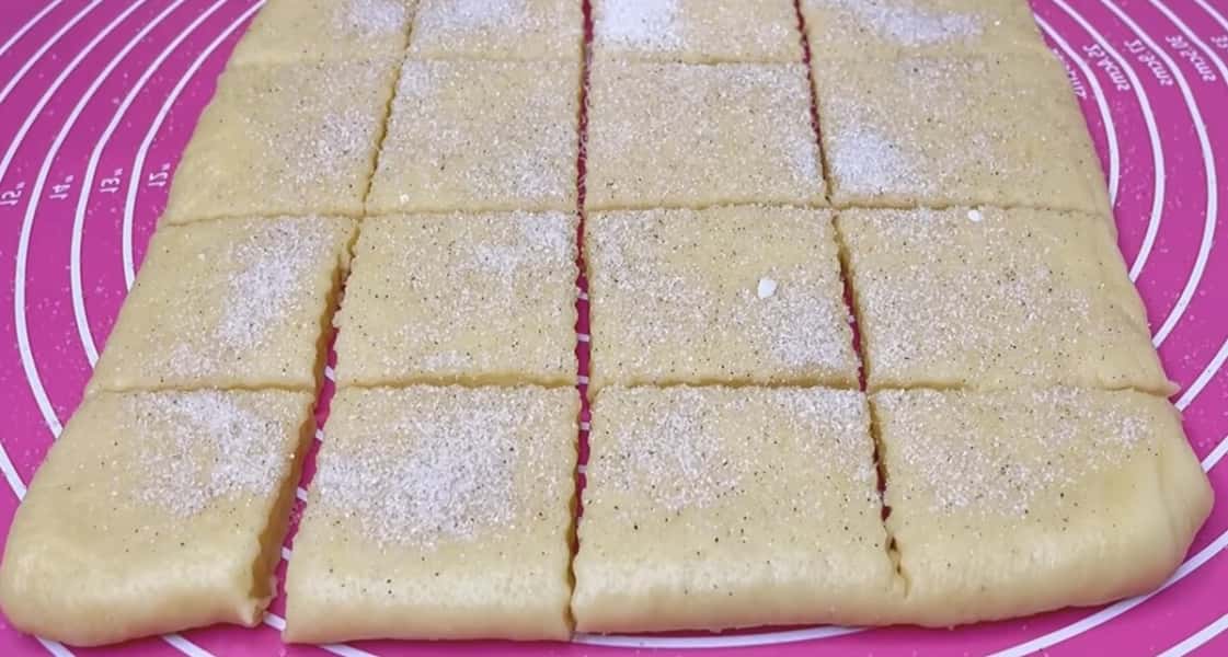 Потім посипаємо цукром, змішаним з корицею і нарізаємо на квадратики.