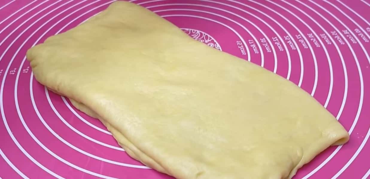 Знову трохи розкачуємо і посипаємо на половину цукром. Складаємо навпіл і розкачуємо.