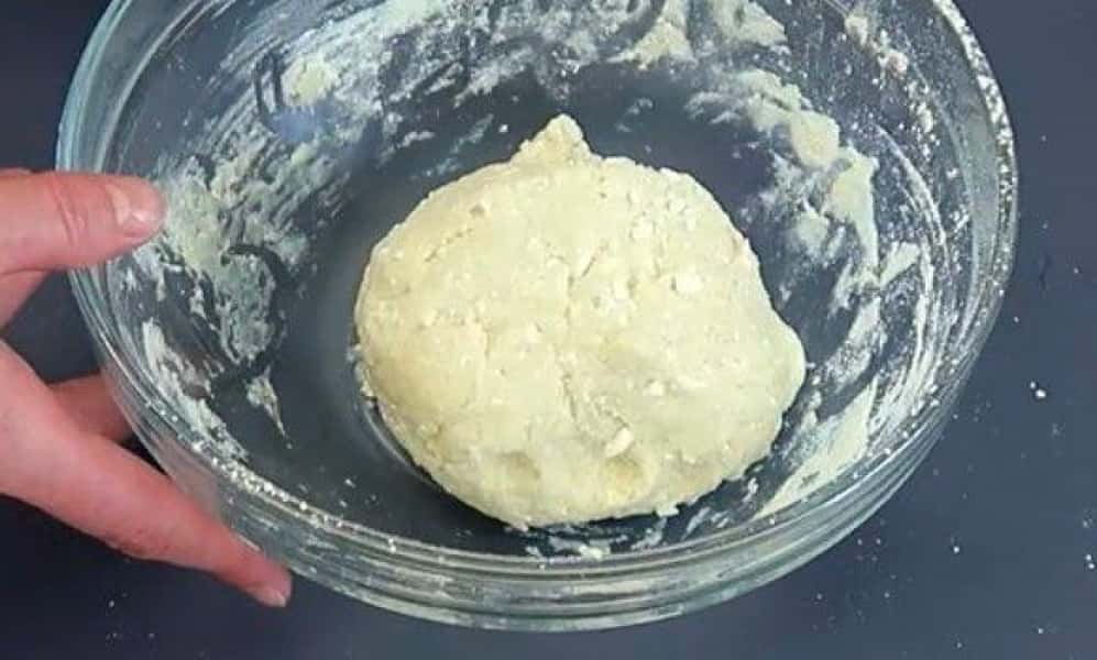 Просіюємо борошно з розпушувачем, перемішуємо ложкою, потім замішуємо тісто руками. Прибираємо в холодильник на 30 хвилин.