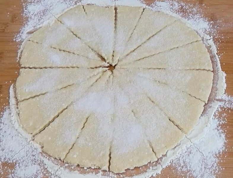 Робочу поверхню присипаємо борошном і викладаємо тісто. Нарізаємо на 16 трикутників і присипаємо цукром.