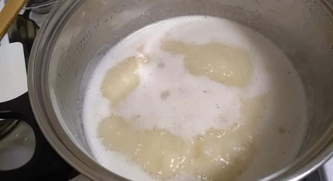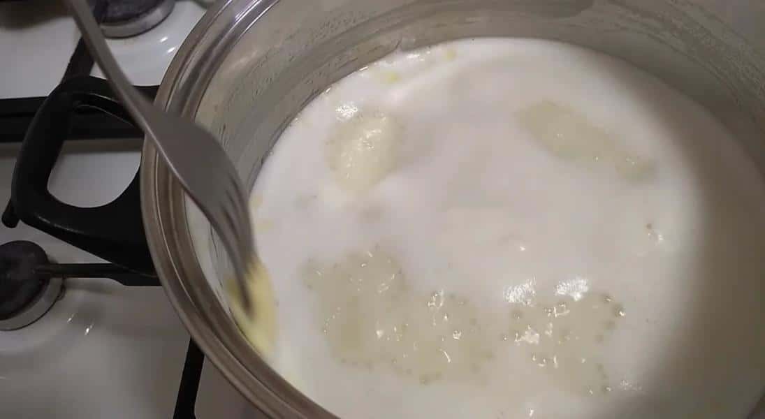 Молоко трохи прогрілося, беремо вилку, розколюємо шматочок масла на неї і змащуємо краї каструлі, так молоко при закипанні не так швидко підніматиметься, і не пригорятиме. Таку процедуру з маслом можна буде повторити ще раз у процесі варіння.