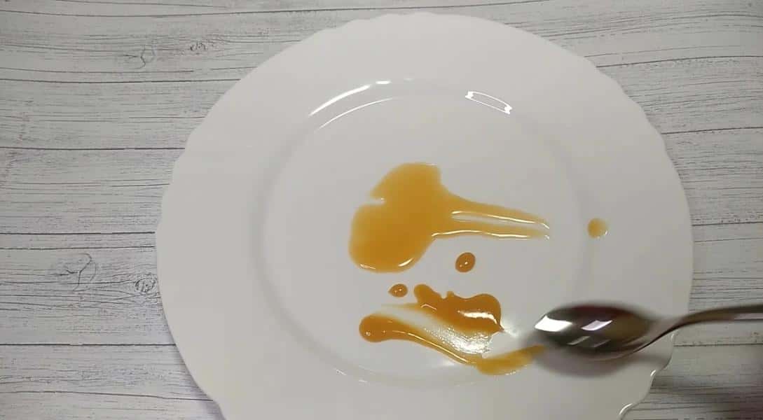 Пройшло 55 хвилин, згущене молоко ще уварилося, стало густішим. У цей час можна починати перевіряти молоко на готовність. Беремо трохи згущеного молока наливаємо на тарілку, проводимо ложкою, якщо краї згущеного молока сходяться один до одного, згущене молоко ще треба проварити 7-10 хвилин.