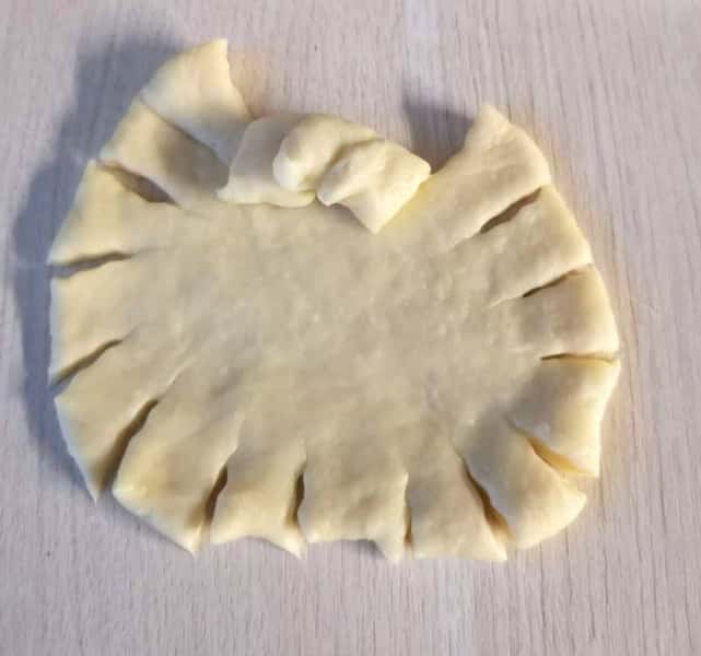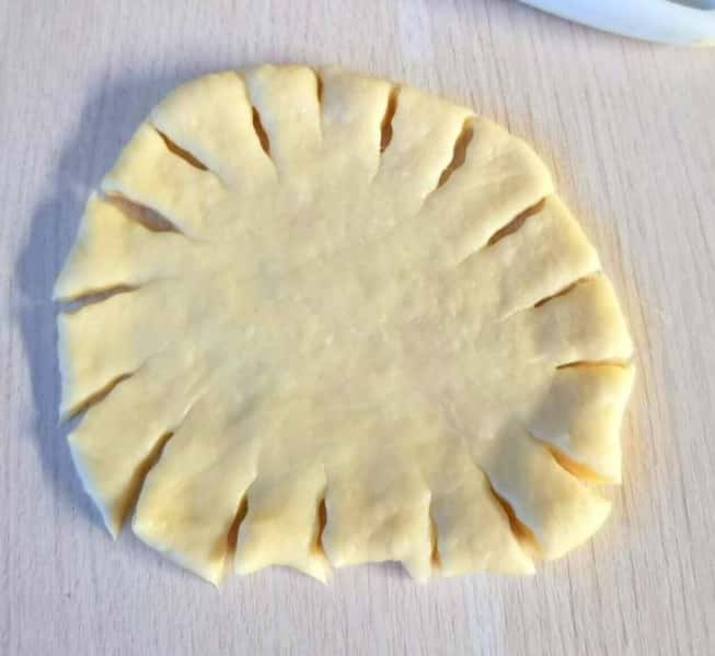 - Потім кожну кульку розкотіть у коржик, зробіть по колу надрізи (фото).