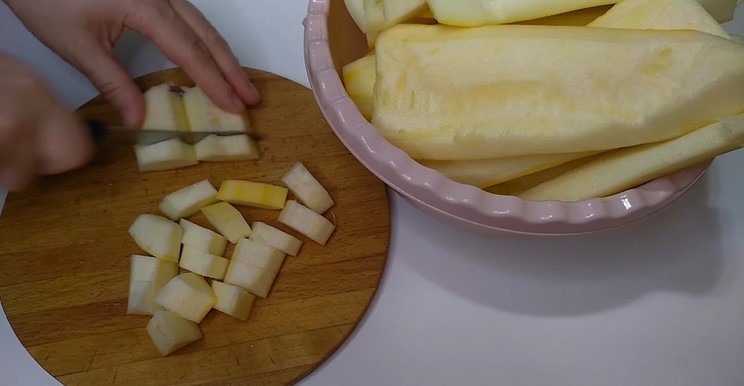 Кабачки миємо, очищаємо від шкіри, м’якоті і насіння. Нарізаємо на шматочки.