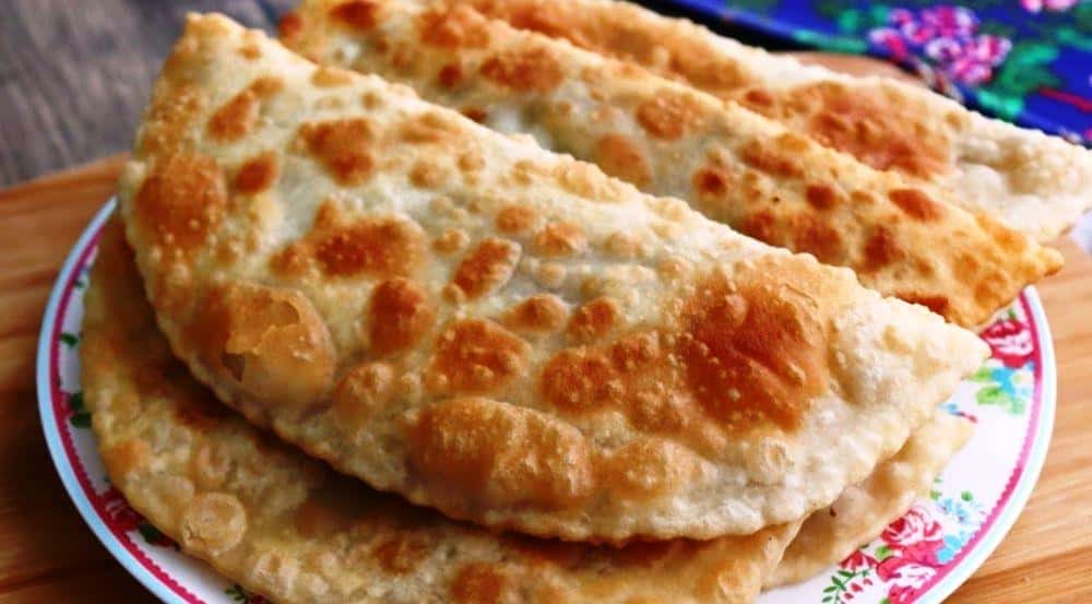 Стіл присипаємо борошном і розкачуємо кожен колобок в тонкий коржик, викладаємо начинку і формуємо чебуреки – пиріжки.