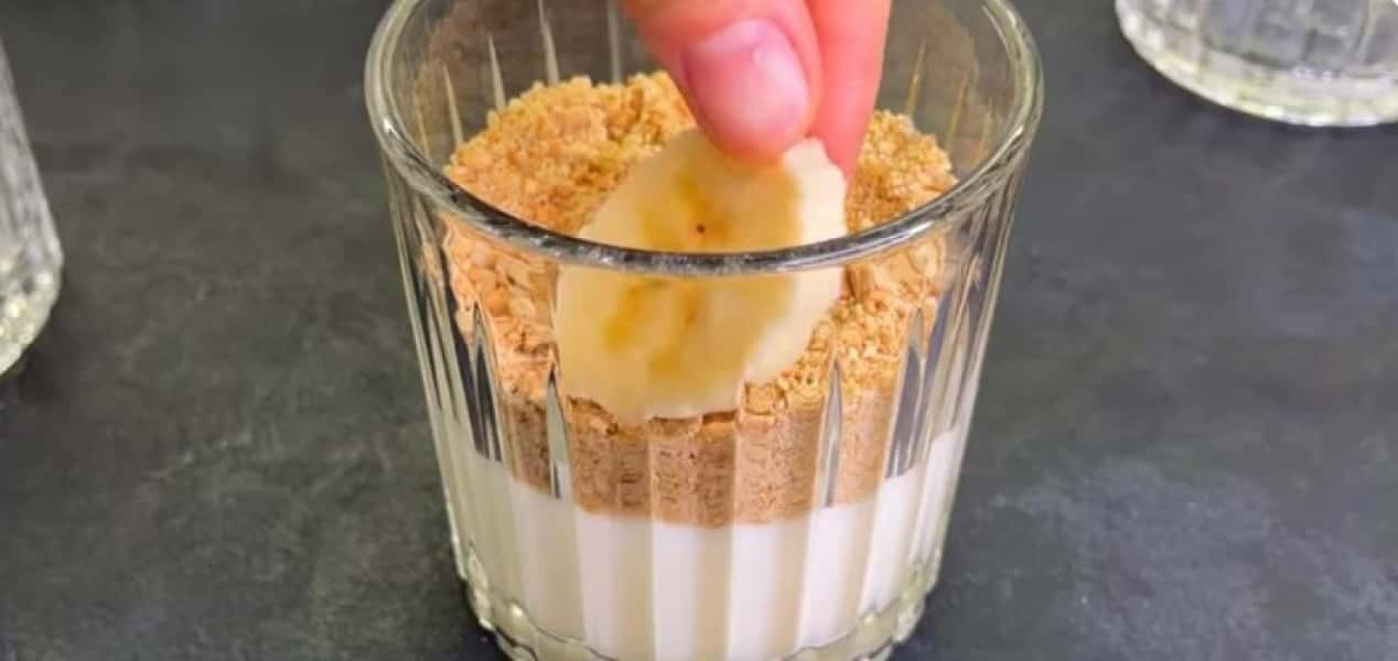 - У ємності для десерту вливаємо білий крем, додаємо печиво та банан.
