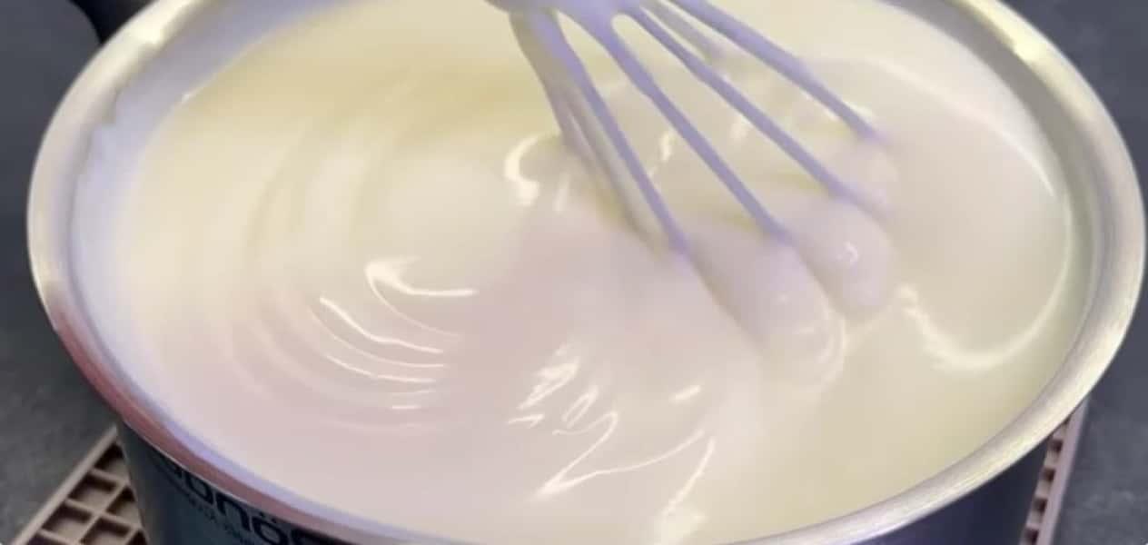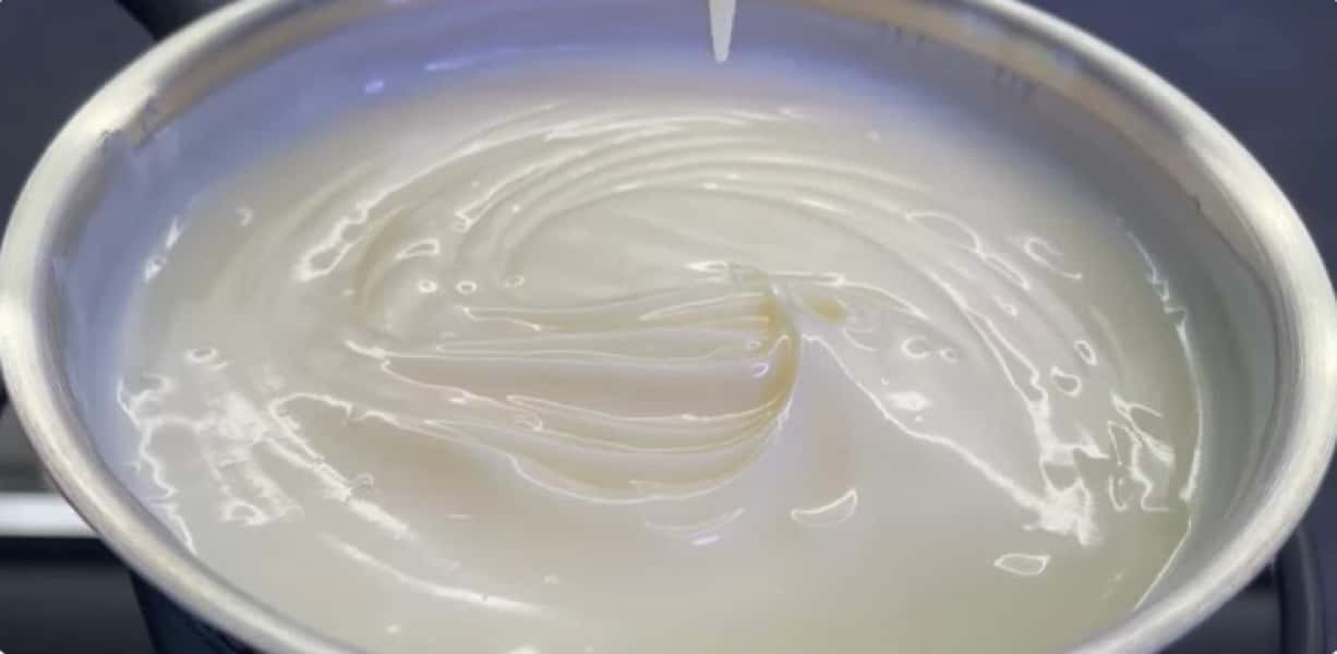 - Вливаємо яєчний жовток, молоко та перемішуємо. Ставимо на повільний вогонь, варимо до загустіння, постійно перемішуючи. Потім залишаємо кипіти 30-40 секунд.