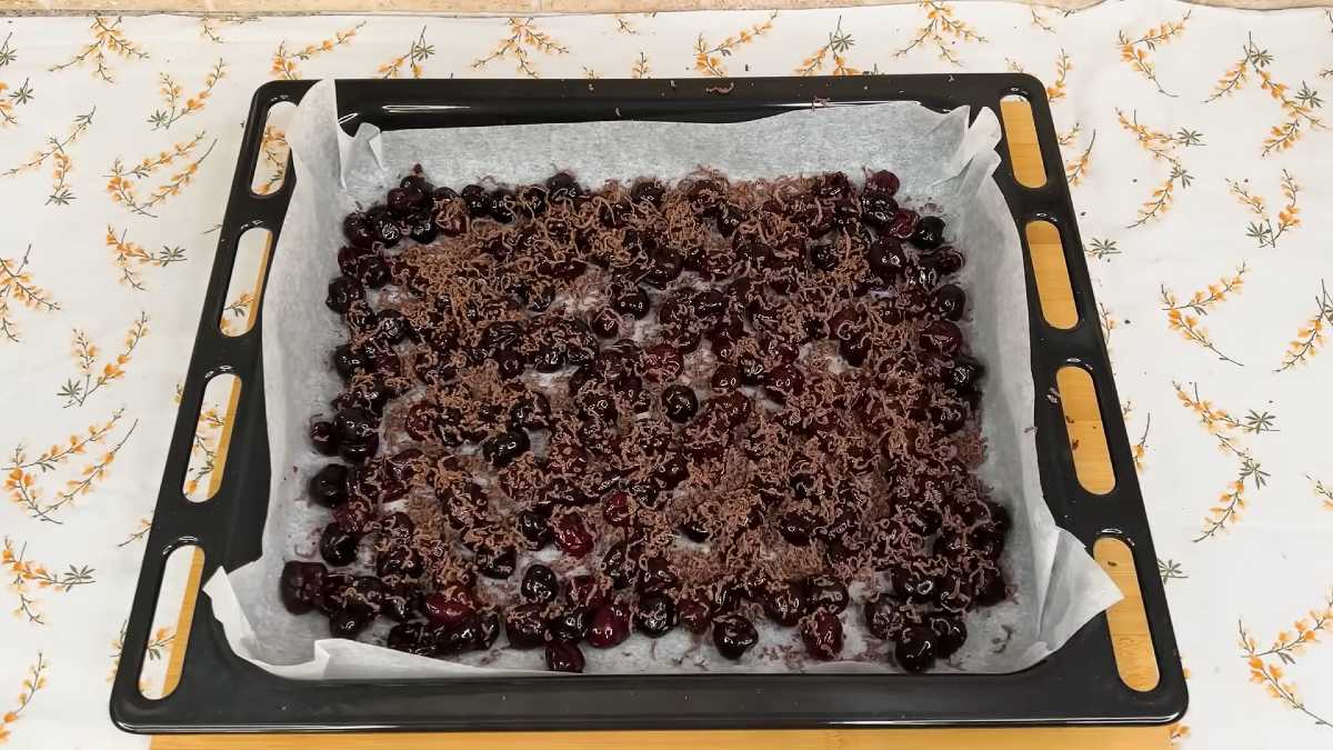 - Застеліть деко розміром 36 х 32 см пергаментом і викладіть вишні. Рівномірно розподіліть їх по дну. Зверху натріть на дрібній терці 20 – 30 г шоколаду.