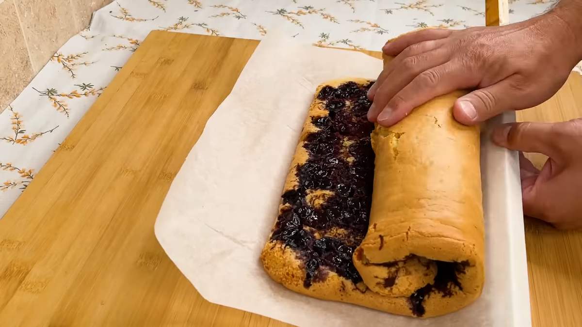 - Вилийте тісто на вишні і розрівняйте за формою. Випікайте бісквіт 30 хвилин при температурі 180 градусів. Переверніть пласт, видаліть пергамент і поверніть бісквіт в рулет, поки він гарячий. Загорніть в лист пергаменту і відкладіть в сторону.