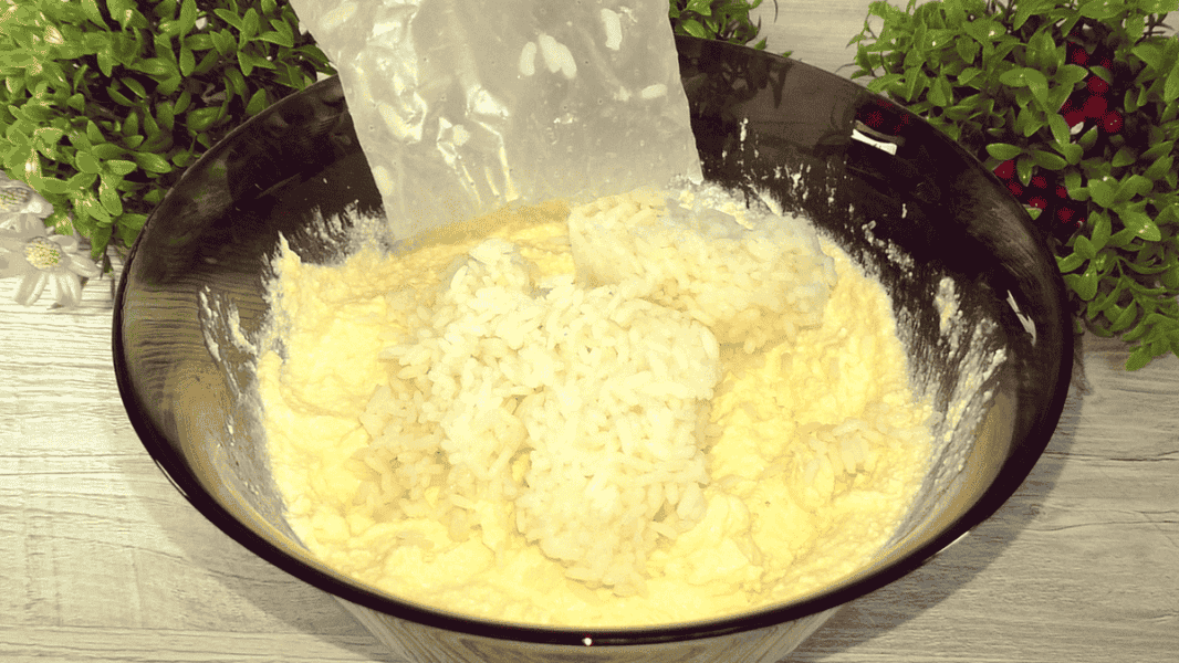 Рис відварити до готовності, остудити, додати в сирну масу і добре перемішати.