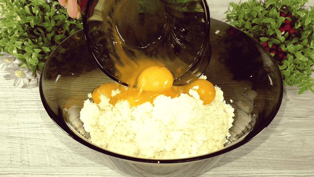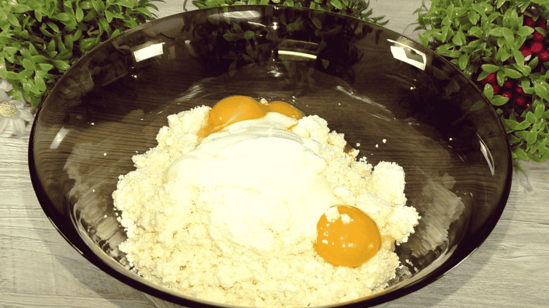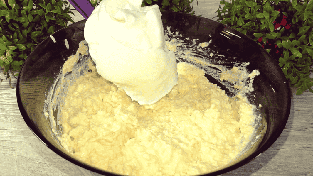 У сир ( у мене 5% ) додаємо жовтки. Білки поки прибираємо в сторону їх ми будемо окремо збивати з дрібкою солі.