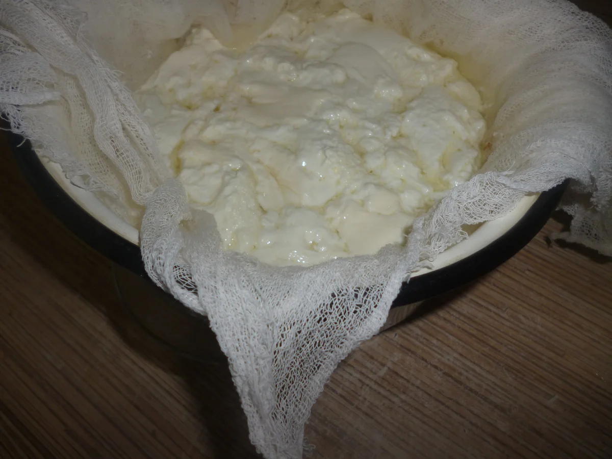 Друшляк застилаємо марлею в 3 шари. Намагаючись не порушувати структуру, акуратно переливаємо масу в друшляк. Даємо стекти сироватці. Віджимати не треба, у жодному разі! Краще поставити друшляк трохи під нахилом, трохи підняти краєчок марлі.