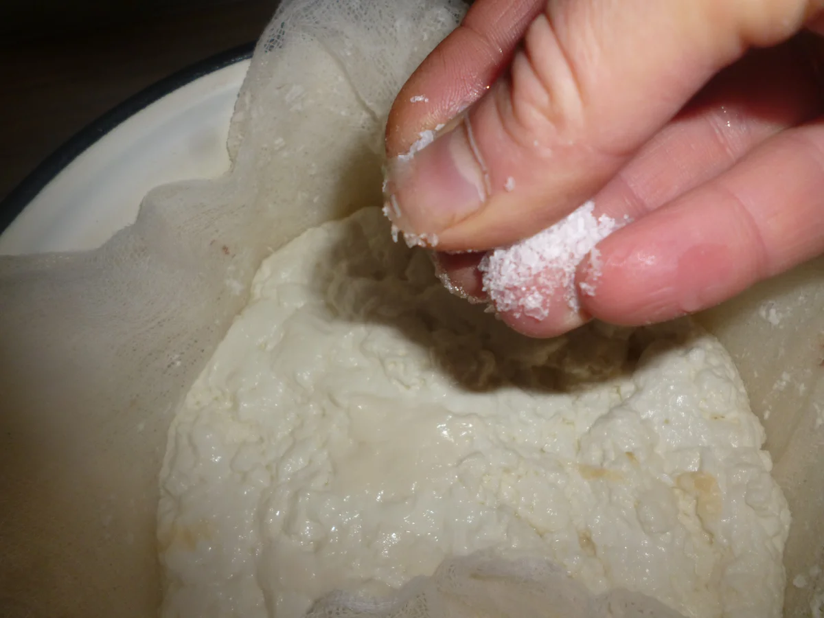 Коли сироватка стече, солимо масу зверху досить щедро, але не перемішувати, щоб сир не втратив структуру!