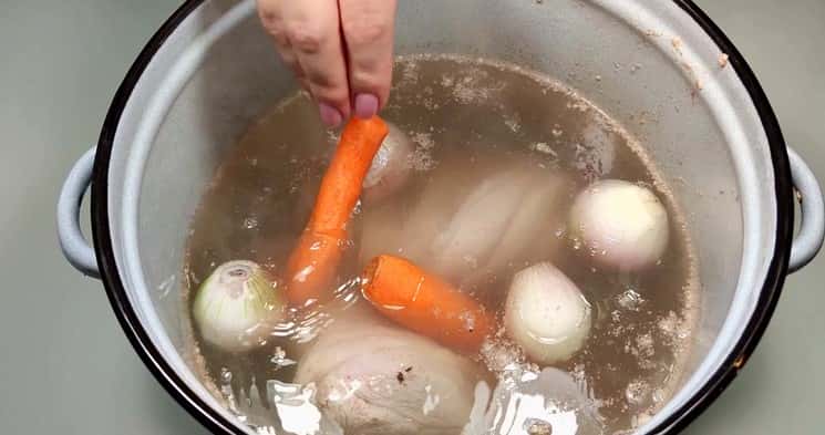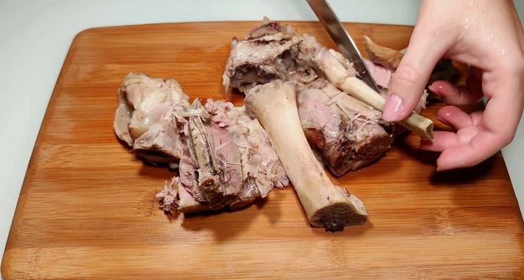 - Потім шумівкою виймаю рульки з бульйону та остуджую. Далі відокремлюю м’ясо від кісток, шкіри та судин.