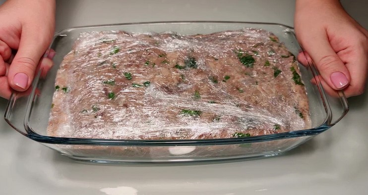 - Потім викладаю м’ясо у форму вистелену харчовою плівкою та прибираю в холодильник на ніч.