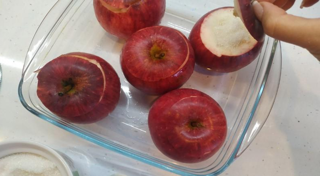 Потім у кожне яблучко насипаємо по пів чайної ложки цукру, його кількість залежатиме від солодкості яблук – якщо кислі, то кладіть більше.