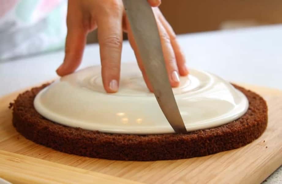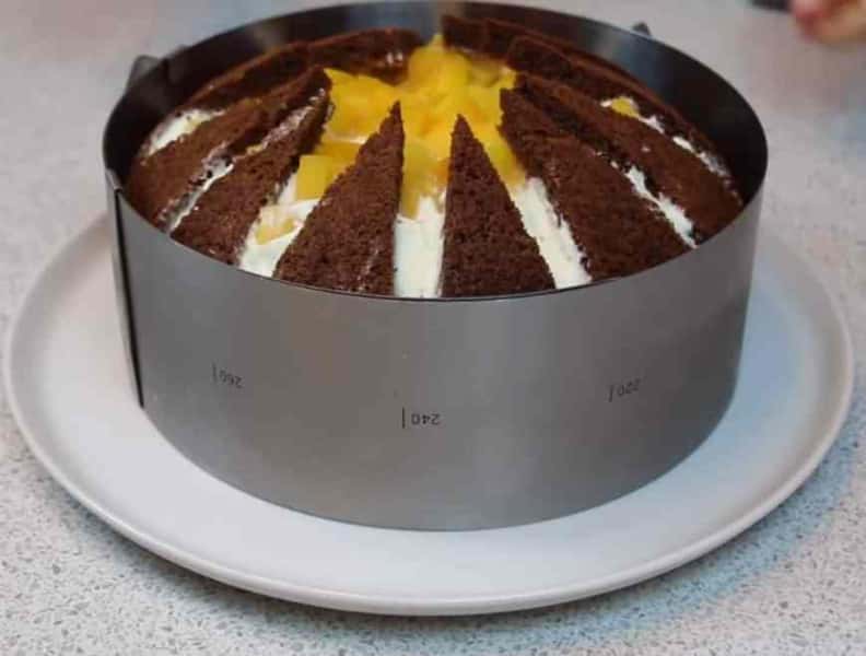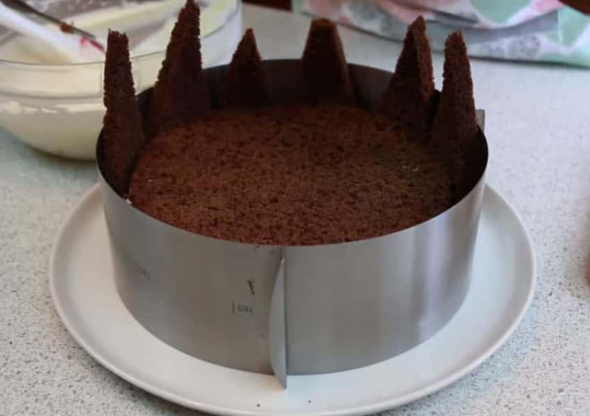 На тарілку викладіть перший корж, покладіть на нього стінку другого коржа та встановіть кондитерське кільце, щоб зафіксувати коржі.