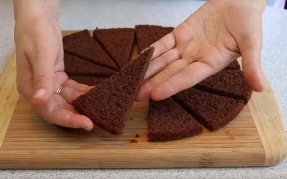 Помістіть у форму по колу трикутні шматочки бісквіту. Накрийте крем вирізаною серединою коржа.
