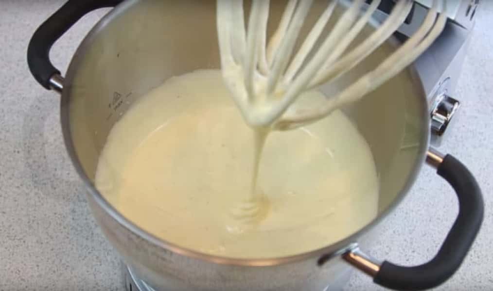 Яєчно-цукрова маса повинна збільшитися у розмірі в 2-3 рази та стати щільною.