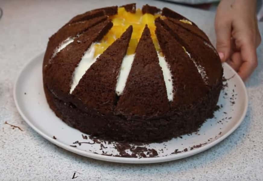 Верхній тонший корж розділіть на 12 рівних трикутників.